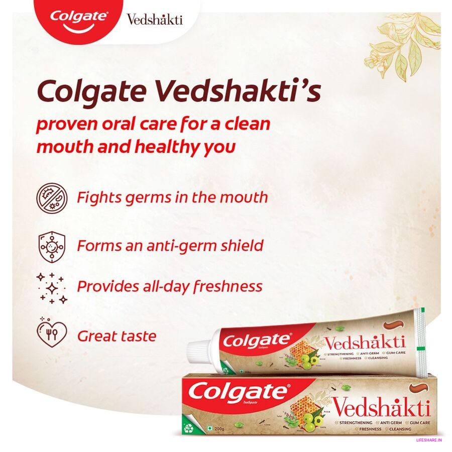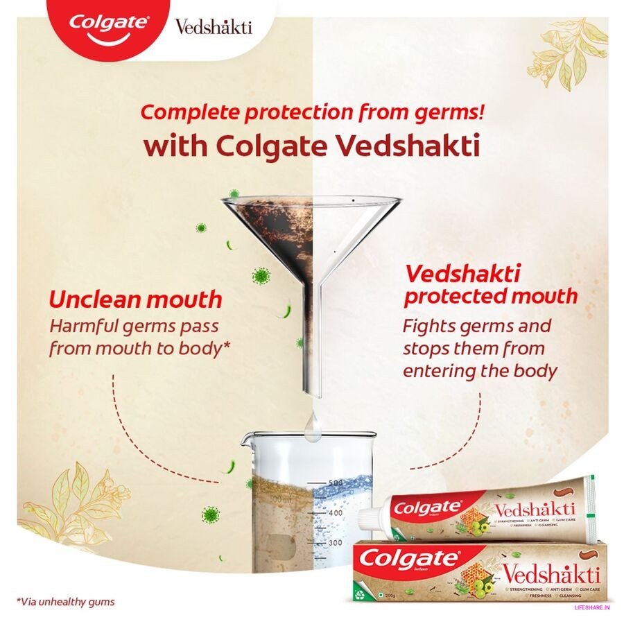 Colgate Vedshakti Toothpaste helps fight germs in the mouth and helps stop them from entering the body.