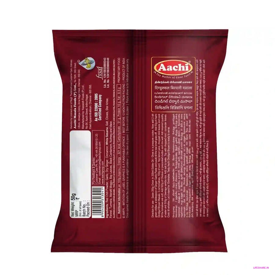 Aachi Dindigul Biryani Masala comes in convenient packaging, with each 50g packet providing enough flavor for a full family meal.