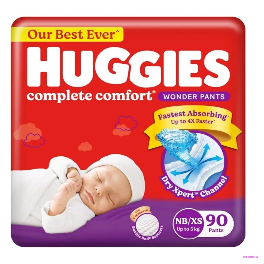 Huggies Complete Comfort Wonder Pants | Pant Style Baby Diapers New Born / XS Size, 90 Count | India's Fastest Absorbing Diaper, Patented Dry Xpert Channel, Ideal for 0-5 Kgs