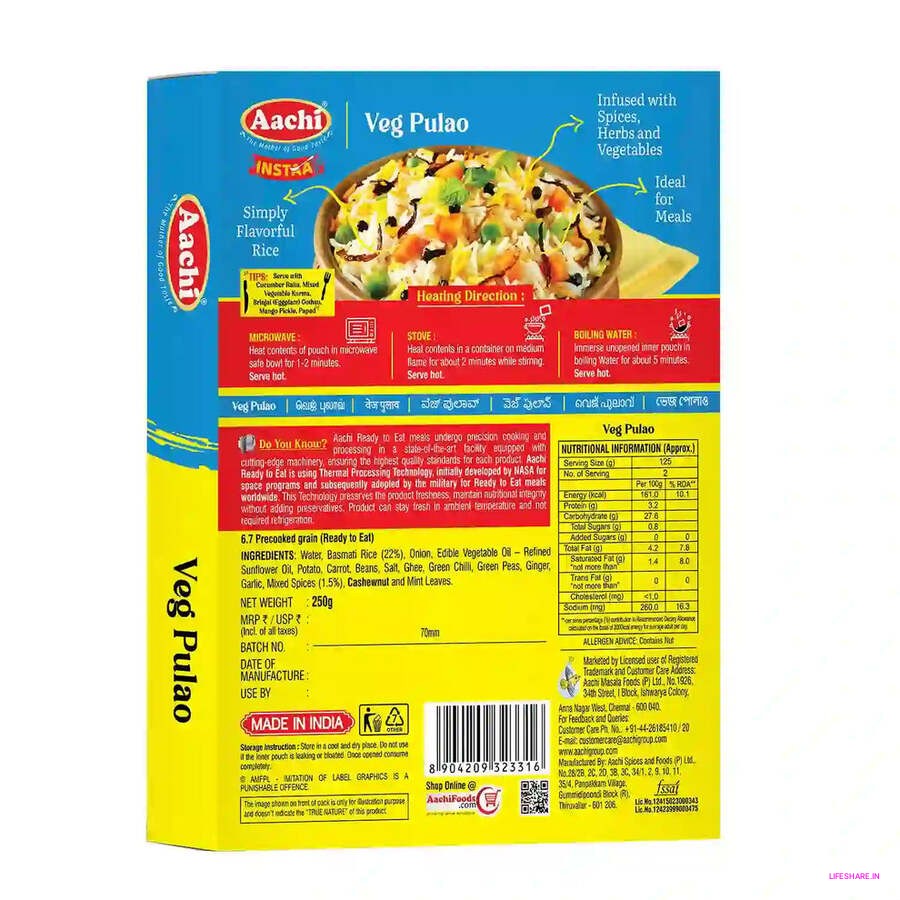 With Aachi Instant Veg Pulao, you can enjoy a delicious, home-cooked meal in no time, while ensuring that all essential food safety practices are followed. This mix is perfect for those who want a wholesome and tasty meal without the time investment of traditional cooking.