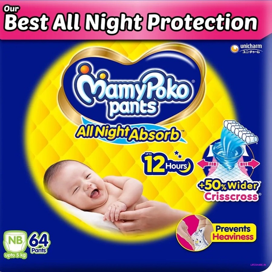 • India's 1st Pant style diaper & Mother's first choice. Introducting New and Improved Mamypoko pants All night absorb diaper specially designed to provide upto 12hr protection from leakage and heaviness, so your baby enjoys uninterupted sleep all night.