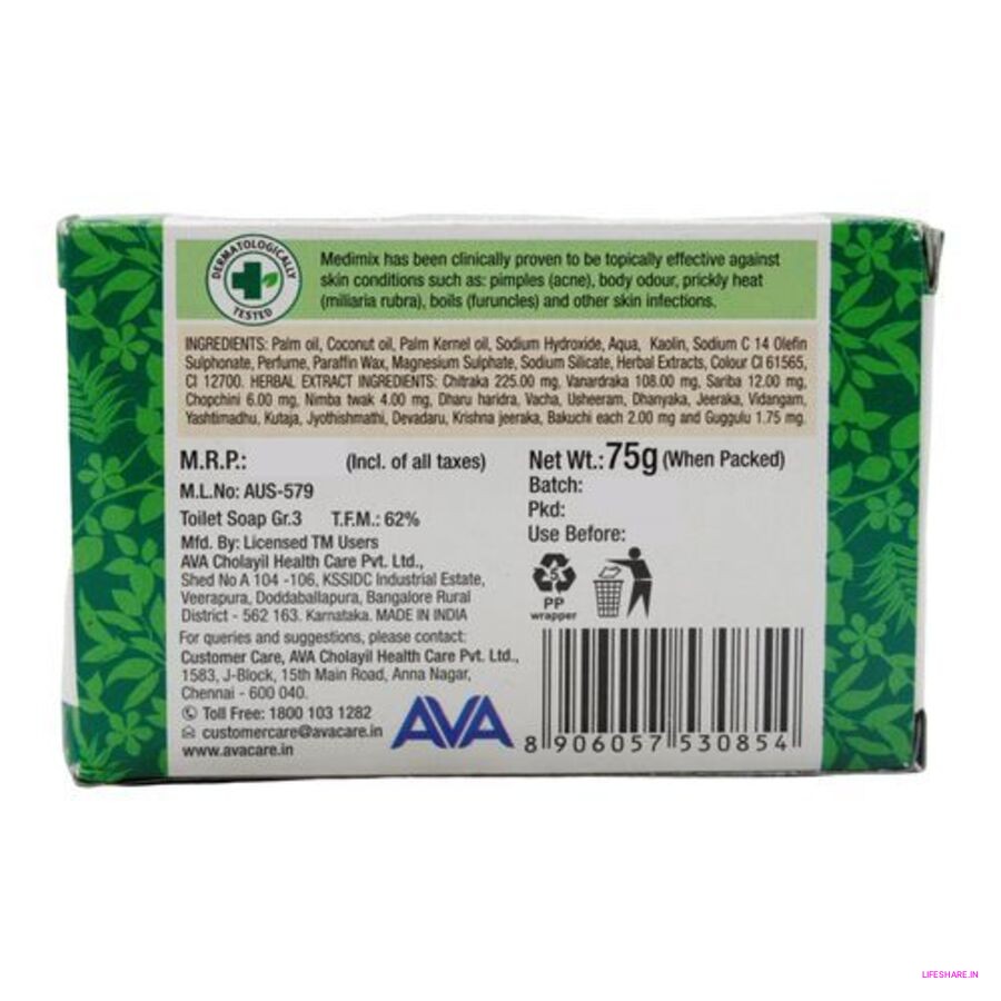 Medimix Ayurvedic Bathing Soap is a traditionally crafted herbal soap enriched with the goodness of 18 natural herbs. Known for its deep cleansing and skin-purifying properties, it gently nourishes the skin while protecting it from pimples, body odor, and other skin infections. Its unique Ayurvedic formulation helps maintain healthy, glowing, and blemish-free skin. Free from harsh chemicals, Medimix offers a natural and refreshing bathing experience with a soothing fragrance that keeps you feeling fresh all day.