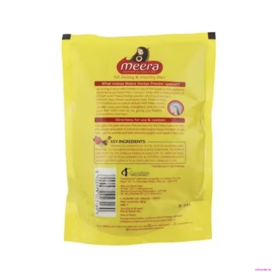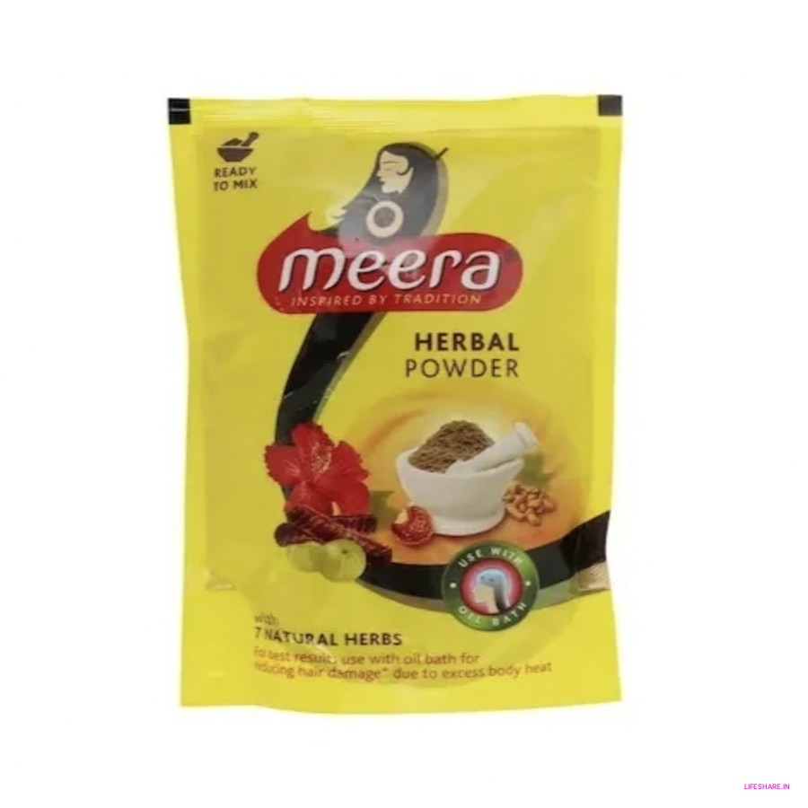 Meera Herbal Hairwash Powder is a natural product that helps you clean and care for your hair. It's like a special powder shampoo made from herbs. You mix it with water to make a paste and put it on your hair.