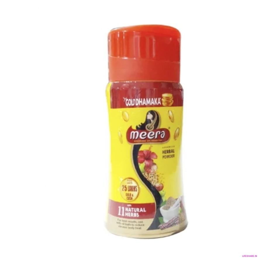 Meera Herbal Hairwash Powder is a natural powder that you can use to clean your hair. It's like a special shampoo, but in a powder form. You mix it with water to make a paste, and then you put it on your hair