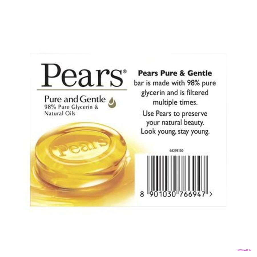 Pears Pure & Gentle Bathing Bar is a mild and refreshing soap enriched with the goodness of natural oils and pure glycerin. Known for its transparent look and signature fragrance, it gently cleanses the skin while locking in natural moisture, leaving it soft, smooth, and glowing. Its hypoallergenic formula makes it suitable for all skin types, including sensitive skin. Dermatologically tested, Pears has been trusted for generations as a gentle yet effective bathing bar that nurtures the skin with every wash.