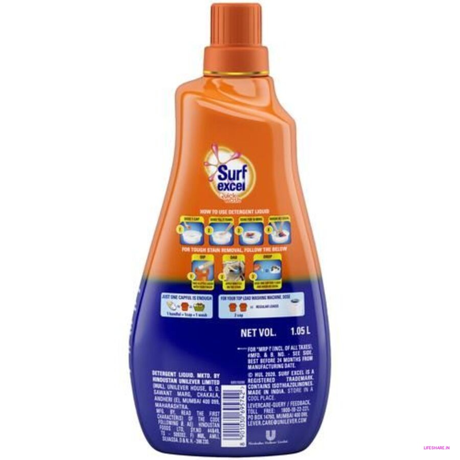 Surf Excel Quick Wash Liquid Detergent is a powerful liquid formula designed to remove tough stains quickly and effectively. Its advanced stain-busting technology penetrates deep into fabric fibers, lifting dirt and grime while being gentle on clothes. Suitable for both bucket wash and machine wash, it dissolves easily in water, leaving no residue. The liquid detergent is convenient to measure, spreads evenly, and delivers a fresh, long-lasting fragrance. Perfect for everyday laundry, Surf Excel Quick Wash ensures brighter, cleaner clothes in just one wash.