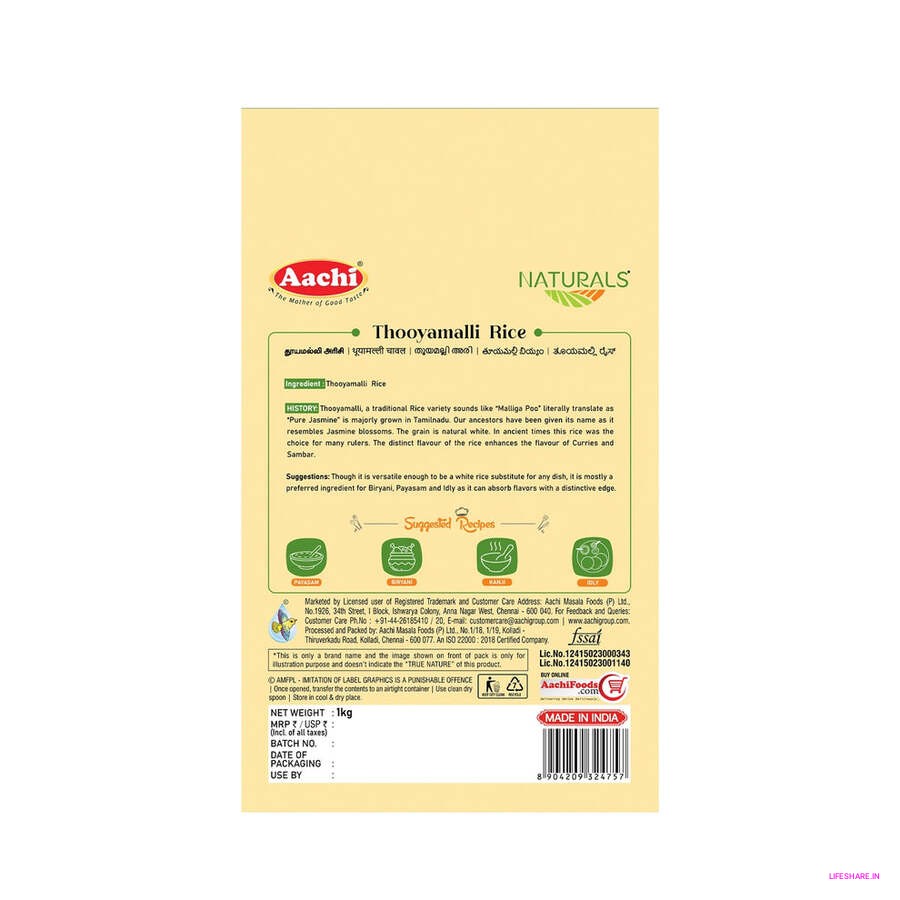 When you choose Aachi Thooyamalli Rice, you're embracing a rich heritage and adding a healthy, flavorful ingredient to your cooking. Its unique aroma, combined with its nutritional benefits, makes it a must-have in kitchens where quality and authenticity matter. Whether you are preparing a festive spread or a simple weekday meal, this rice offers the perfect balance of taste and health.