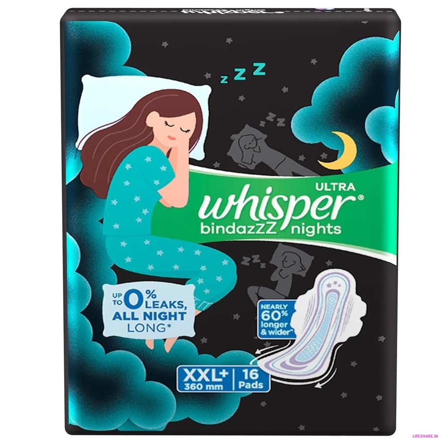 Whisper Bindazzz Nights Sanitary Pads XXL+ 360 mm are designed for ultimate overnight protection. Their extra-long length and wings provide a secure fit, ensuring maximum absorbency and comfort, so you can rest easy during your menstrual cycle without leaks.